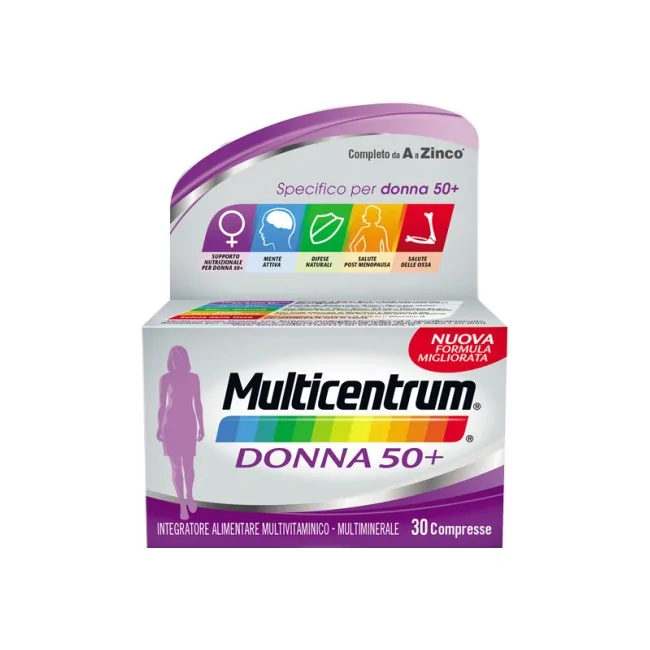 Multicentrum Donna 50+ è un integratore alimentare multivitaminico-multiminerale completo, formulato per soddisfare i fabbisogni nutrizionali delle donne dopo i 50 anni.