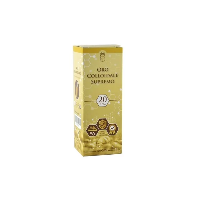 Oro Colloidale Supremo 20ppm è un dispositivo medico con minuscole particelle d'oro sospese in soluzione acquosa, utile per migliorare le difese immunitarie. Formato 100 ml