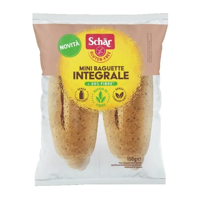 Dr. Schar Mini Baguette Integrale sono piccoli panini integrali senza glutine e senza lattosio, ideali per chi soffre di intolleranze alimentari o segue una dieta specifica. Formato: La confezione contiene 4 pezzi da 37,5 g ciascuno.