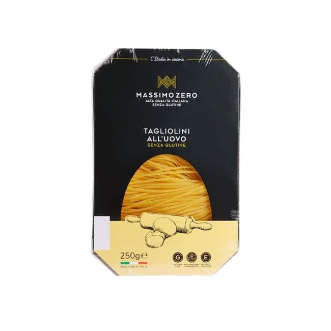 Massimo Zero Tagliolini All'Uovo sono tagliolini all'uovo senza glutine, realizzati con uova fresche per un sapore autentico e una perfetta tenuta in cottura, ideali per chi cerca una pasta di alta qualità adatta a diete specifiche. Formato: 250 grammi