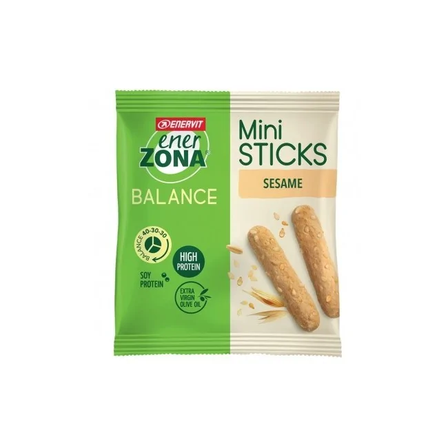 Enerzona mini sticks. Prodotto da forno a base di farina di grano tenero e proteine vegetali. Con semi di sesamo.