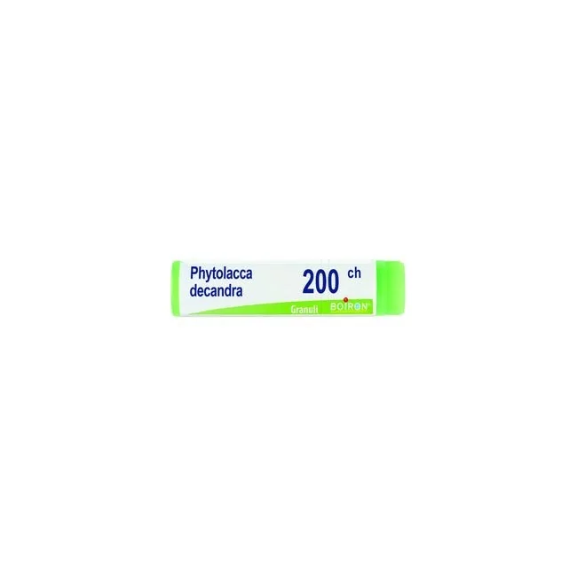 Boiron Phytolacca Decandra 200ch globuli medicinale omeopatico è un rimedio omeopatico preparato attraverso un processo di diluizione e dinamizzazione, che consiste nel diluire ripetutamente una sostanza di partenza (vegetale, animale o minerale) e nel sottoporla a scuotimenti energici. Questo processo, secondo i principi dell'omeopatia, potenzia l'azione del rimedio.