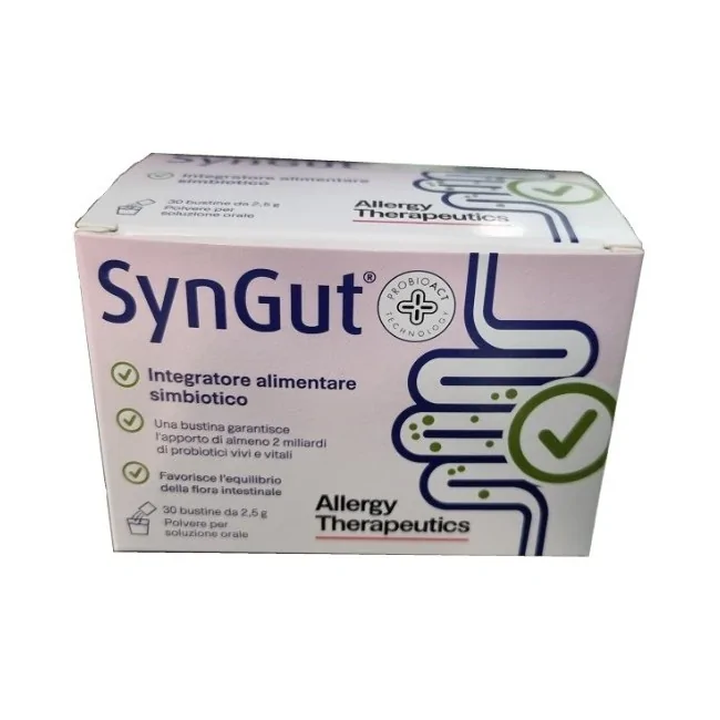 Syngut 30 Bustine è un integratore alimentare simbiotico a base dei probiotici Bifidobacterium lactis W51, Lactobacillus acidophilus W22, Lactobacillus plantarum W21, Lactococcus lactis W19 ed inulina che favorisce il riequilibrio della flora intestinale. E' un integratore Allergy Therapeutics.