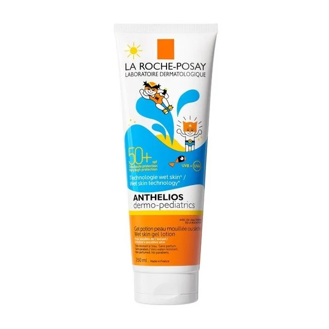 Anthelios dermo-ped wetskin protezione solare spf50+gel fresco e leggero da applicare su pelle asciutta o bagnata, utile per proteggere dalle radiazioni solari. Tubo da 250 ml