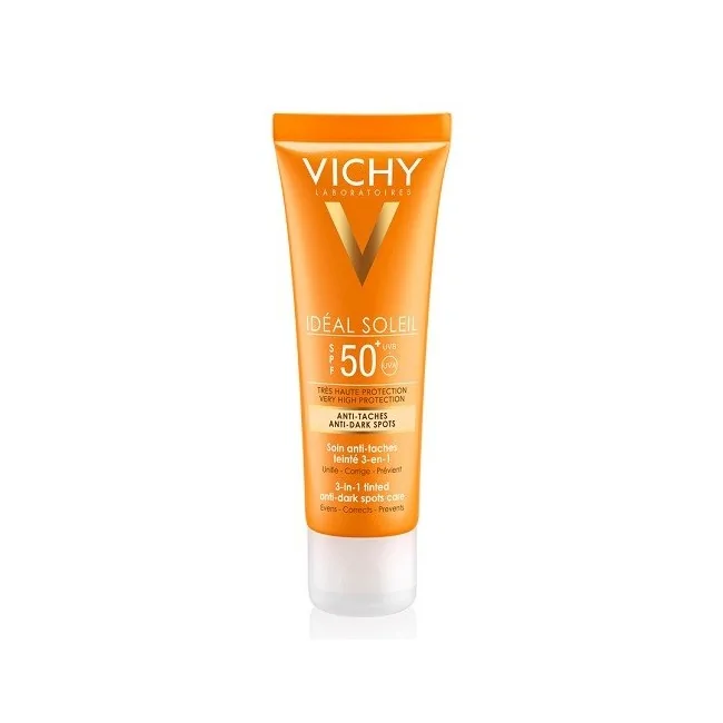 Vichy Ideal soleil viso anti-macchie è un trattamento colorato 3 in 1 che corregge le macchie, uniforma l'incarnato e protegge dai raggi solari.