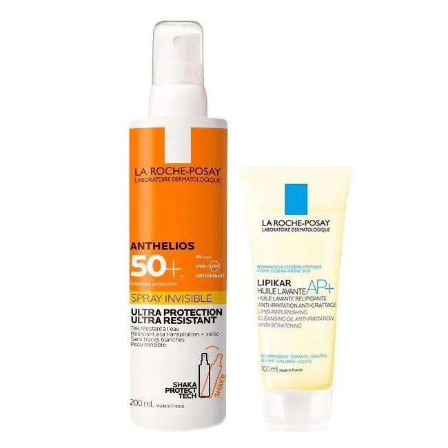 Anthelios spray invisibile è una protezione solare per adulti in confezione da 200 ml + olio detergente antiarrossamento Lipikar 200 ml