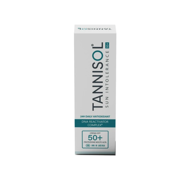 Tannisol SPF 50+ Sun Intolerance Crema solare antiossidante per uso quotidiano con protezione molto alta contro raggi UVA/UVB, IR e Luce Blu. Con DNA Reactivator Complex®, è ideale per pelli intolleranti o per prevenire fotoinvecchiamento e macchie. Formato: 50 ml