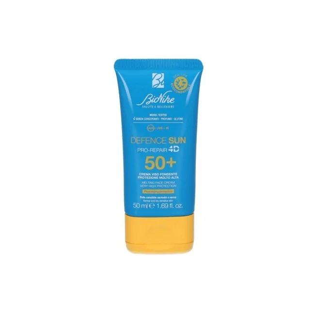 BioNike Defence Sun 50+ Crema Viso Fondente è una protezione solare molto alta (SPF 50+) per il viso, dalla texture cremosa ma leggera, ideale per pelli sensibili per prevenire fotoinvecchiamento e danni solari. Formato: 50 ml
