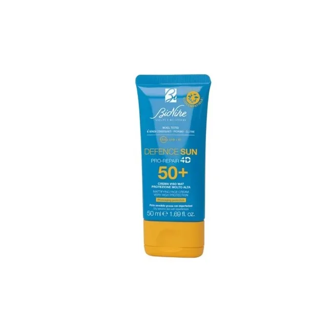 BioNike Defence Sun 50+ Crema Viso Mat è una protezione solare molto alta (SPF 50+) specifica per il viso, che offre un'azione opacizzante e sebo-regolatrice, ideale per pelli miste, grasse e sensibili. Formato: 50 ml