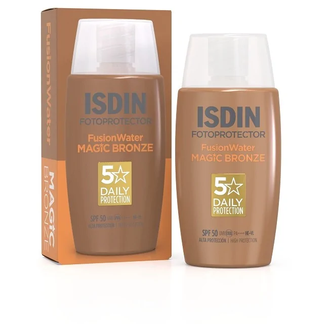 Isdin Fusion Water Magic Color Bronze SPF50 (50 Ml) è un fotoprotettore viso ultraleggero a base acquosa con un leggero colorante effetto Bronze, ideale per l'uso quotidiano. Offre un'altissima protezione SPF50, si assorbe immediatamente senza residui grassi, uniforma l'incarnato e non irrita gli occhi (Safe-Eye Tech). Formato: 50 ml