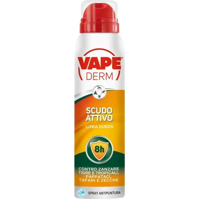 Vape Derm Scudo Attivo è uno spray insetto repellente secco in grado di proteggere la pelle di adulti e bambini da diversi insetti volanti quali zanzara comune, tigre e Anofele, quest’ultima responsabile della trasmissione della malaria.