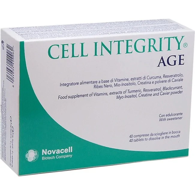 Cell integrity age è un integratore alimentare a base di vitamine, estratti di curcuma, resveratrolo, utile per contrastare l'invecchiamento cutaneo. Formato 40 compresse