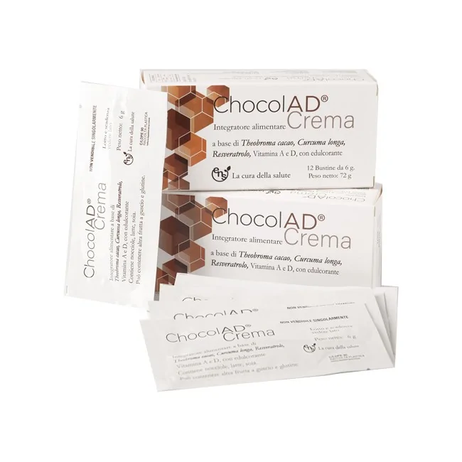 Chocolad Crema è un integratore alimentare al gusto cacao a base di Theobroma cacao, Curcuma longa, Resveratrolo, Vitamine A e D, formulato per supportare l'organismo in un regime di dieta ipocalorica. Formato: 12 bustine