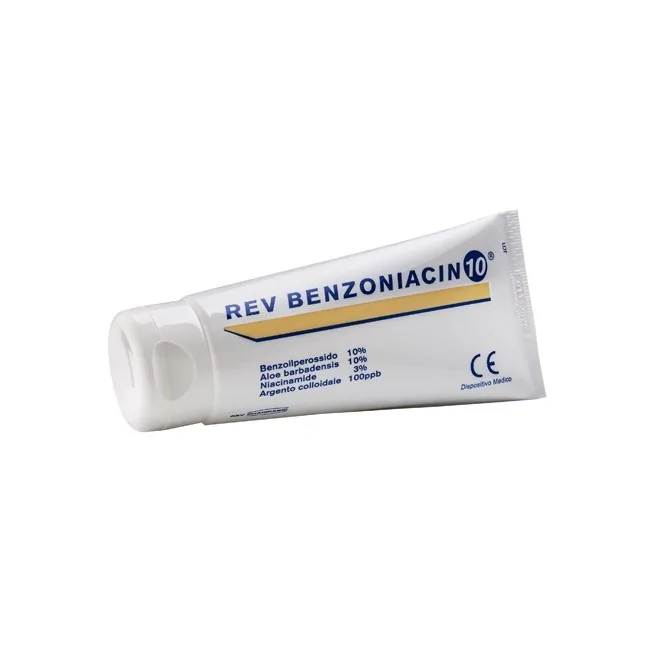 - Rev Benzoniacin 10 Crema è un dispositivo medico per il trattamento topico dell’acne lieve e moderata.