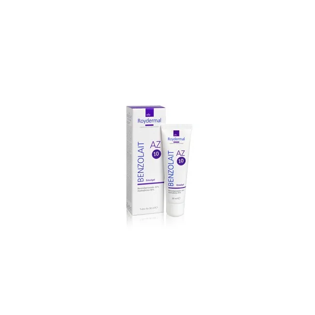 Roydermal Benzolait Az 10 emulgel con Benzoilperossido 10% e Azeloglicina 30% è un prodotto per pelli grasse a tendenza acneica. Grazie alla presenza di benzoil perossido 10%, favorisce la formazione di un film protettivo sulla pelle grassa a tendenza acneica, impedendo la colonizzazione da parte di agenti patogeni.