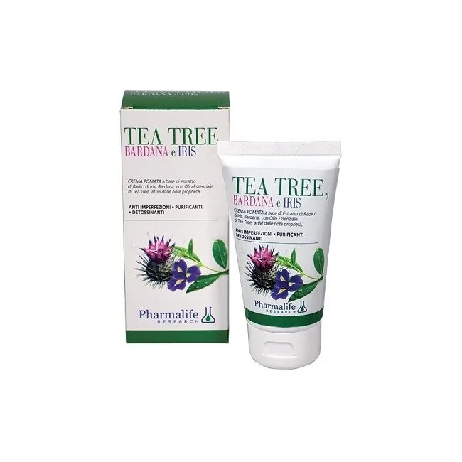 Crema Pomata Tea Tree Bardana & Iris svolge sulla pelle un'azione anti-imperfezioni, detossinante e purificante.