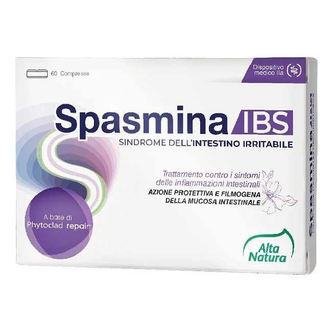 Alta Natura Dm Spasmina Ibs è un dispositivo medico in compresse rivestite, utile per il trattamento della sindrome dell'intestino irritabile (IBS), grazie alla presenza di un complesso a base di Malva e Opuntia che agisce come barriera protettiva sulla mucosa intestinale. Formato: 60 compresse