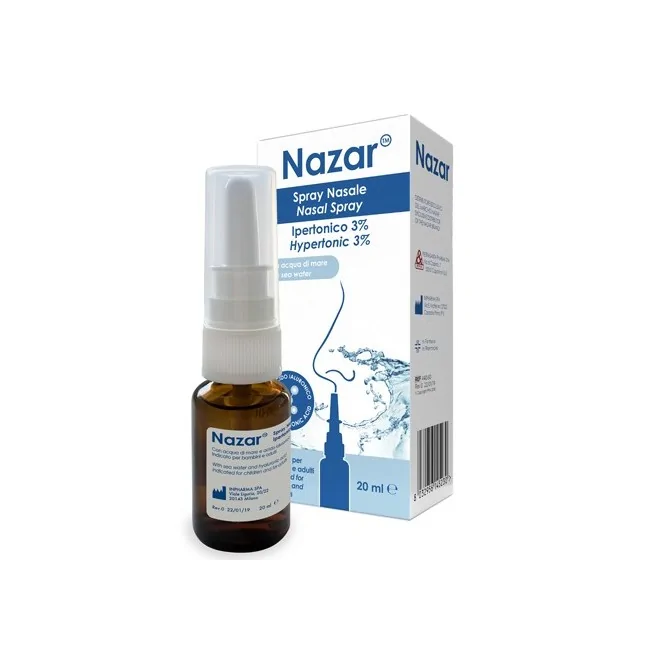 Nazar Spray Nasale Ipertonico è un dispositivo medico per l'igiene nasale di adulti e bambini. Con acido ialuronico. Formato: 20 ml