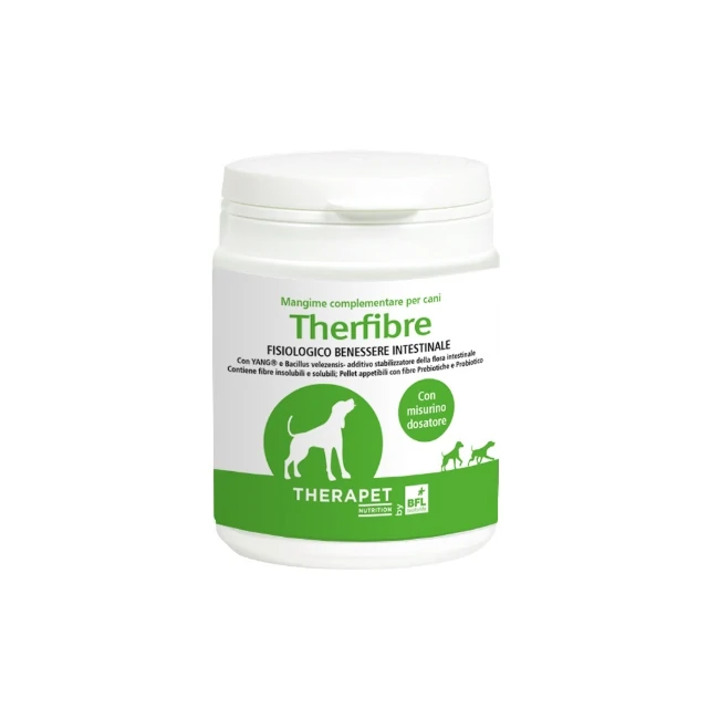 THERFIBRE è un mangime complementare per cani formulato in pellet appetibili con complesso di fibre prebiotiche - YANG e probiotico stabilizzatore della flora intestinale - Bacillus velezensis per favorire il fisiologico benessere intestinale.