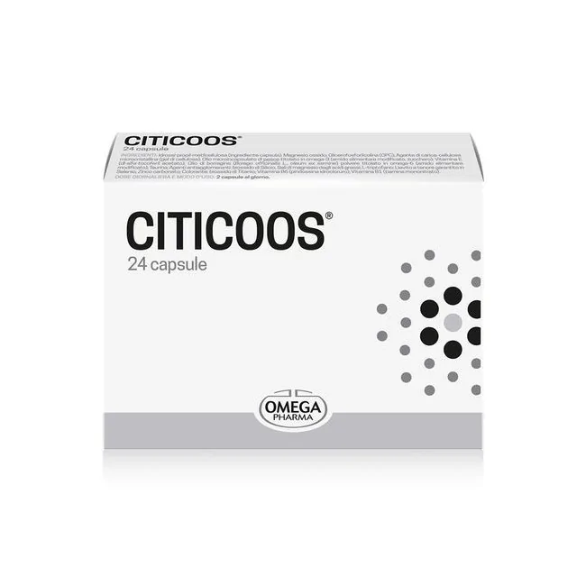 Citicoos capsule integratore alimentare composto da fosfolipidi altamente liposolubili, per una maggior presenza a livello centrale, quali la glicero fosforil colina e la glicero fosforiletanolammina, di aminoacidi essenziali e neurotrasmettitoriali come il Triptofano e laTaurina, di Acidi grassi essenziali poliinsaturi come gli Omega 6 (linoleico egamolenico) e gli Omega 3 (DHA, EPA), di antiossidanti endogeni quali l’Acido Tiottico, la Vitamina E, di Vitamine B1 e B6, di minerali e microelementi come Mg, Se eZn.