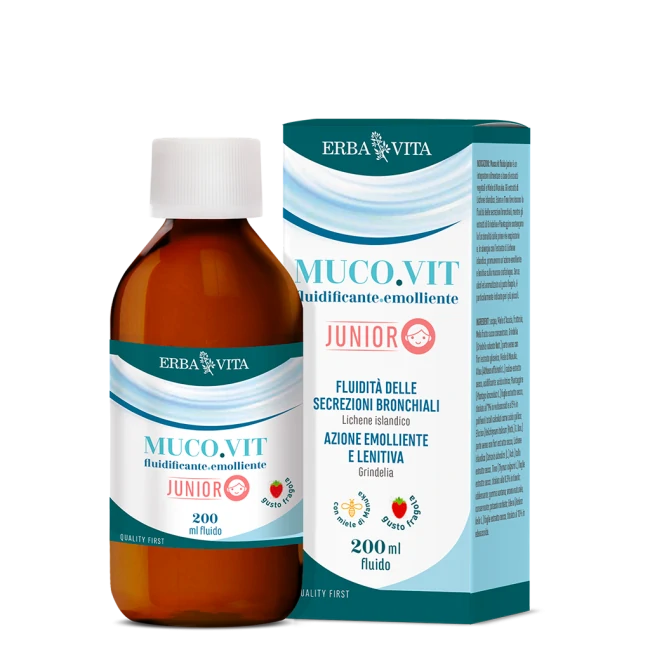 Muco.vit fluido junior è un integratore alimentare a base di estratti vegetali e miele di manuka. Gli estratti di lichene islandico, edera e timo favoriscono la fluidità delle secrezioni bronchiali, mentre gli estratti di grindelia e piantaggine sostengono la funzionalità delle prime vie respiratorie e, in sinergia con l’estratto di Lichene islandico, promuovono un’azione emolliente e lenitiva sulla mucosa orofaringea. Senza alcol ed aromatizzato al gusto fragola, è particolarmente indicato per i più piccoli.