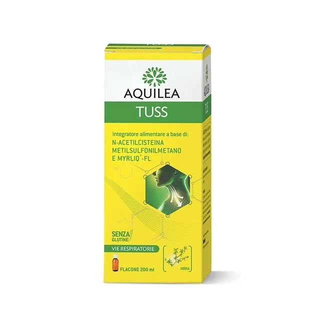 Aquilea Tuss Sciroppo è un integratore alimentare a base di N-Acetilcisteina, Metilsulfonilmetano e MyrLiq-FL.