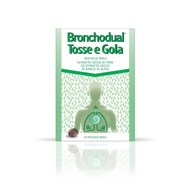 Bronchodual Tosse E Gola è un farmaco di automedicazione a base di estratti vegetali, utile per calmare la tosse. Formato 20 pastiglie molli