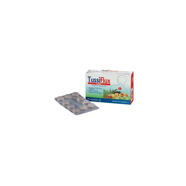 Tussiflux Tosse è un rimedio a base di propoli, tiglio, mirra e aloe in grado di formare un film protettivo utile per calmare la tosse secca. Formato 30 compresse
