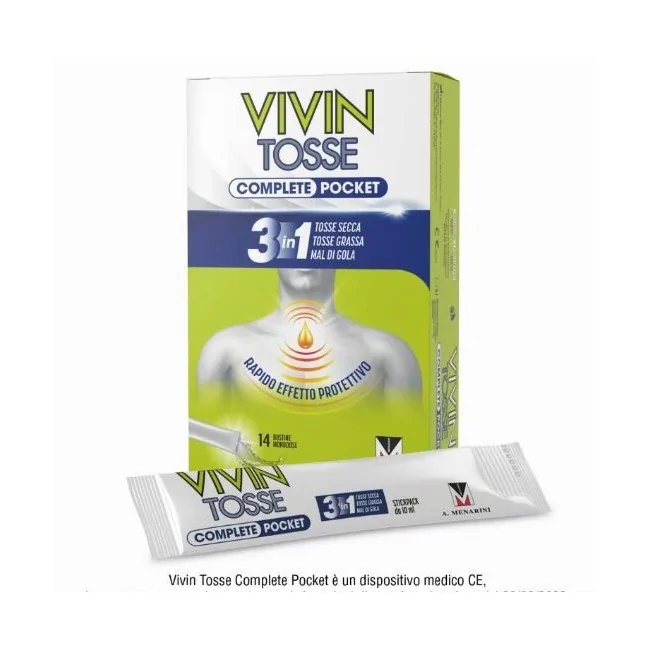 Contrasta ed allevia i sintomi del mal di gola, tossa secca e grassa grazie all’utilizzo di Vivin Tosse Complete 3 in 1. Tale dispositivo medico può essere assunto in qualsiasi momento della giornata grazie alla sua comoda confezione in Stick.