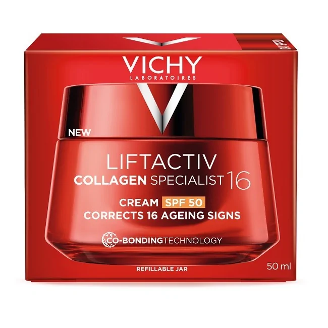Vichy Liftactiv Collagen Specialist 16 Cream SPF50 è un trattamento quotidiano che corregge i segni dell'invecchiamento cutaneo, stimolando la produzione di collagene e offrendo una protezione ad ampio spettro contro i raggi UVB/UVA con fattore SPF 50. Formato: 50 ml