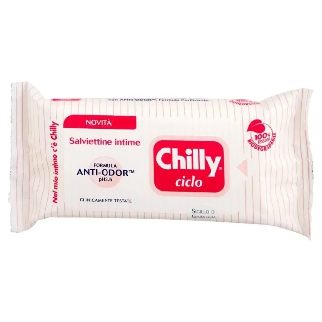 La formula delle Salviettine intime Chilly Ciclo: - è arricchita con complesso di molecole ad azione antiodore e antibatterica, che agisce neutralizzando gli odori e riducendone la formazione. - dona una piacevole sensazione di pulizia anche durante i giorni del ciclo. Provale durante i giorni del ciclo! Ideali per uso quotidiano. Clinicamente testate. Portale sempre con te! al lavoro - in viaggio - in vacanza