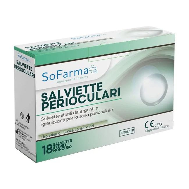 Le Salviette Perioculari Sofarmapiu' sono salviette sterili, detergenti e igienizzanti per l'area perioculare. Imbevute di una soluzione a pH isolacrimale, sono ideali per la pulizia quotidiana e in caso di infiammazioni come blefariti e congiuntiviti. Formato: 18 pezzi
