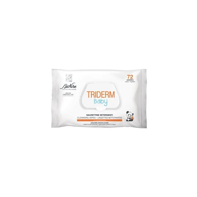 Triderm Baby Salviettine Detergenti delicate arricchite con ingredienti lanitivi, utili pre la pulizia del viso e del corpo del neonato. Formato 72 pezzi