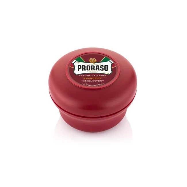 Sapone da barba Proraso Barbe Dure in ciotola ideale per ammorbidire le barbe più resistenti e folte. Formula potenziata con Burro di Karité e Olio di Sandalo per una rasatura profonda e confortevole. Formato: 150 ml