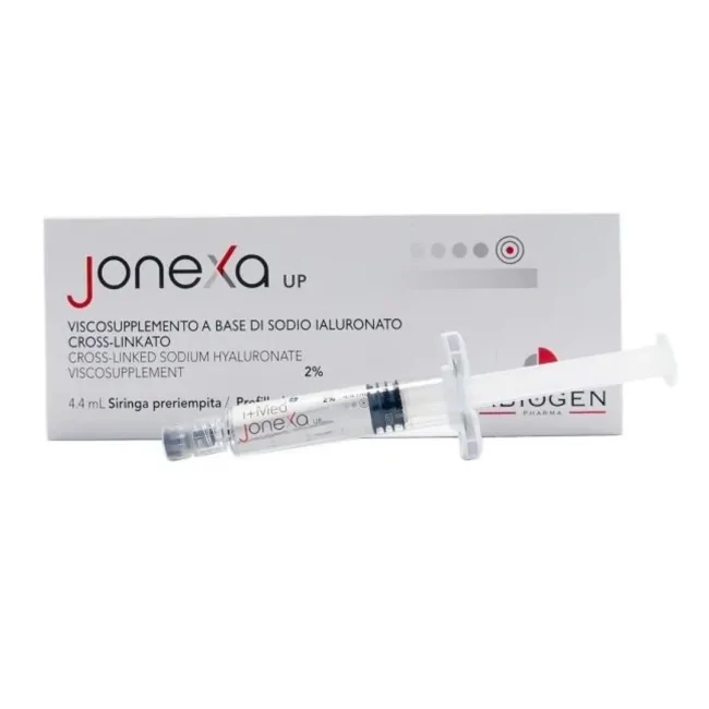 Jonexa Up Siringa Intra-articolare Sodio Ialuronato Cross-linkato 2% è un dispositivo medico a base di acido ialuronico (HA) iniettato nello spazio articolare per il trattamento dell'osteoartrosi. Formato 4,4 ml