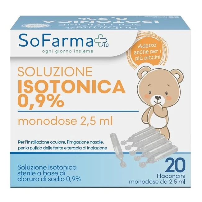 La Soluzione Salina 0,9% Sofarmapiù è un dispositivo medico ideale per l'igiene quotidiana di naso e occhi e per la terapia inalatoria. Grazie alla sua formula isotonica sterile, deterge delicatamente le mucose, facilita la rimozione del muco e favorisce il benessere delle vie respiratorie. Formato: 20 fiale