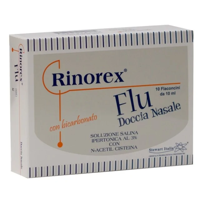 Rinorex Flu Doccia Nasale è una soluzione salina ipertonica a pH controllato con N-Acetil Cisteina, utile per decongestionare le fosse nasali. Formato 10 flaconcini