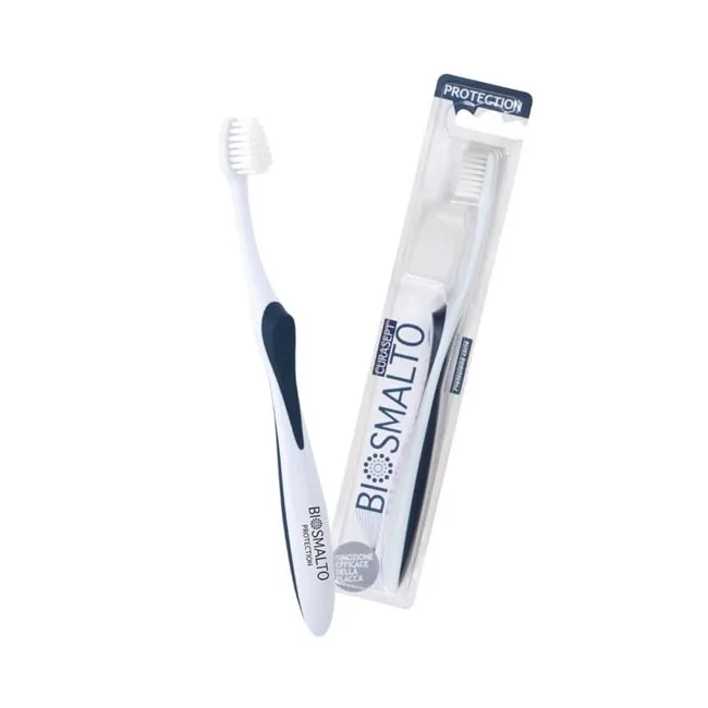 Spazzolino consigliato in abbinamento con i prodotti Biosmalto Protezione Carie, dotato di setole morbide, sottili e flessibili, presenti in numero elevato, che già dal primo passaggio offrono grande efficacia nella rimozione della placca senza danneggiare lo smalto.