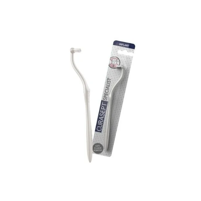 Curasept spazzolino implant è un dispositivo per l'igiene orale con setole morbide, per la pulizia di protesi