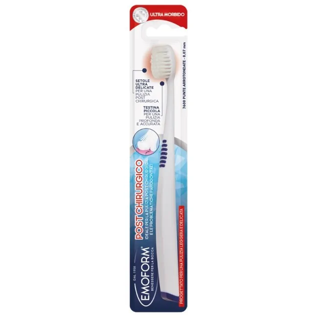 Emoform Spazzolino Post Chirurgico è un prodotto per l'igiene orale con setole morbide utile in caso di gengive irritate. Formato 1 pezzo