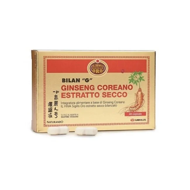 Ginseng Bilan-g capsule è un integratore alimentare a base di estratto secco di Ginseng Coreano naturalmente bilanciato, utile per fornire energia e vitalità all'organismo. Formato 40 capsule