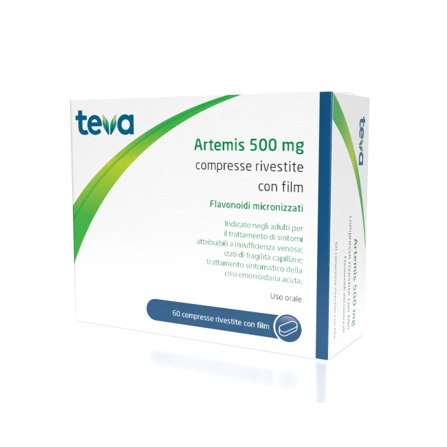 Artemis Teva 500 mg è un farmaco venotonico a base di Diosmina ed Esperidina micronizzate per il trattamento dei sintomi dell'insufficienza venosa (gambe pesanti, gonfiore) e della crisi emorroidaria acuta. Formato: 20 compresse
