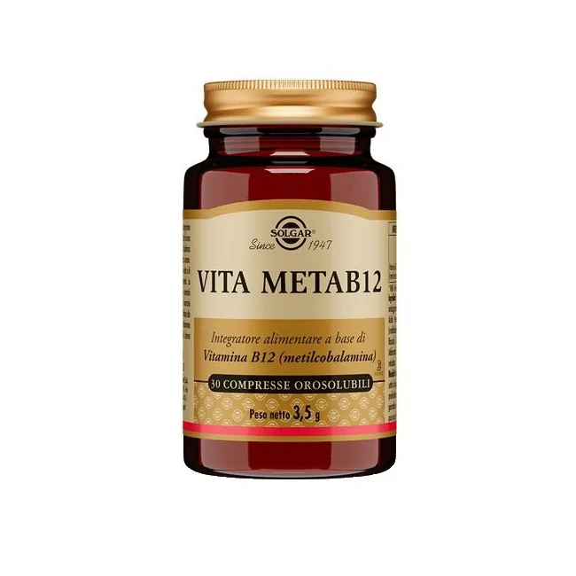 Solgar Vita Metab12 è un integratore alimentare a base di vitamina B12 sotto forma di metilcobalamina, la forma biochimica fisiologicamente presente nel corpo umano. Utile nei casi di ridotto apporto con la dieta o di aumentato fabbisogno di tale nutriente. La vitamina B12 contribuisce alla normale formazione dei globuli rossi e al normale metabolismo dell'omocisteina. Contribuisce alla riduzione della stanchezza e dell'affaticamento e al normale funzionamento del sistema nervoso.