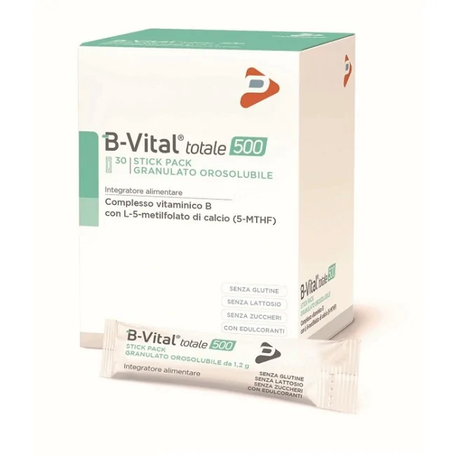 Pharma Line B-vital Totale 500 è un integratore alimentare ad alto dosaggio di vitamine del gruppo B, inclusa la B12 (500 mcg) e l'Acido Folico (Quatrefolic). È formulato per sostenere il metabolismo energetico, la funzione nervosa e ridurre stanchezza e affaticamento. Formato: 30 stick